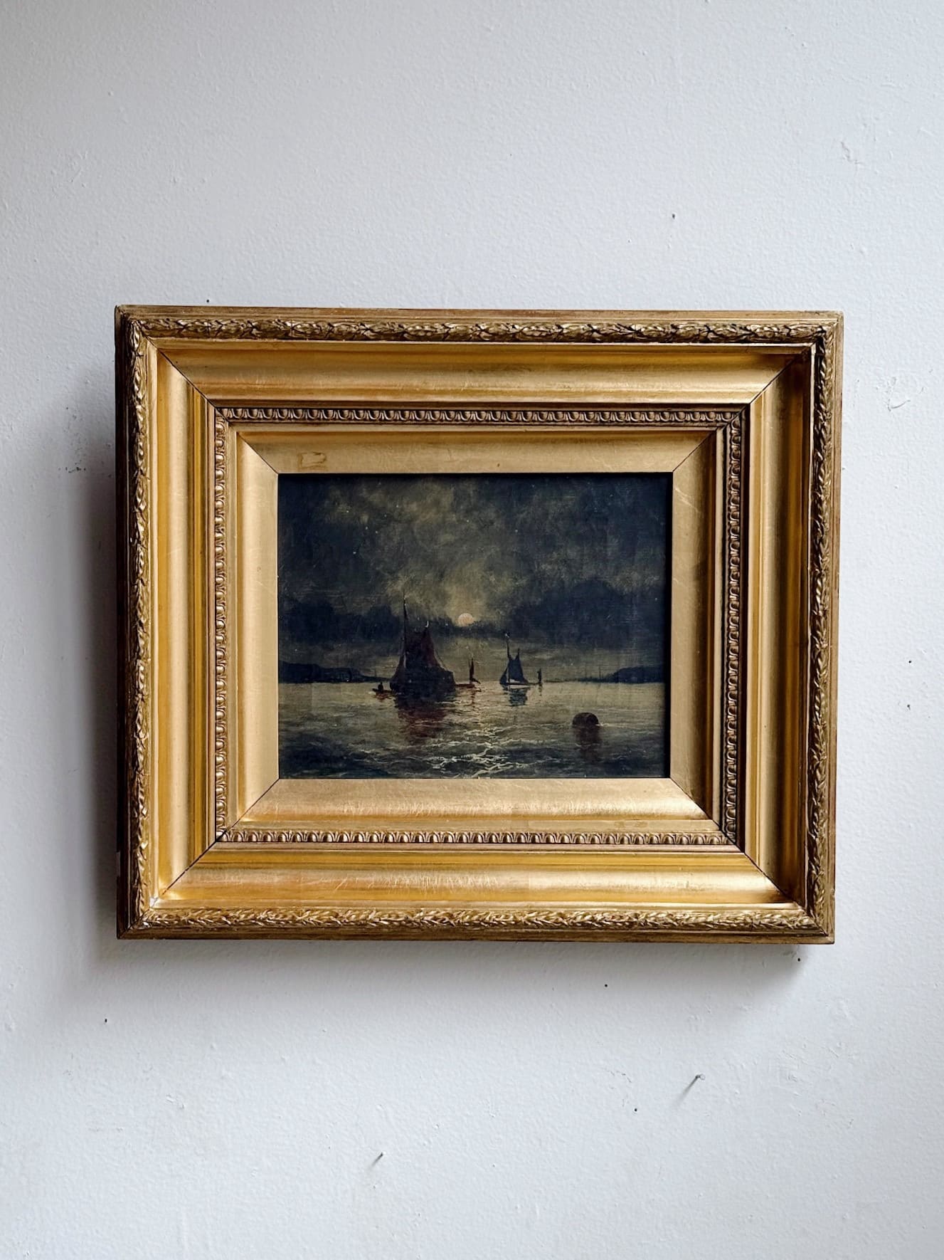 A moody style seascape with beautiful use of light from the moon. We love this slightly mismatched pair for the muted but rich use of color with dark blues and burgundy contrasting a glowy yellow light. The original frame adds stunning character! Please note the chip in this frame. Everything else about this piece is well preserved. Signed in bottom left corner “T. Murray”