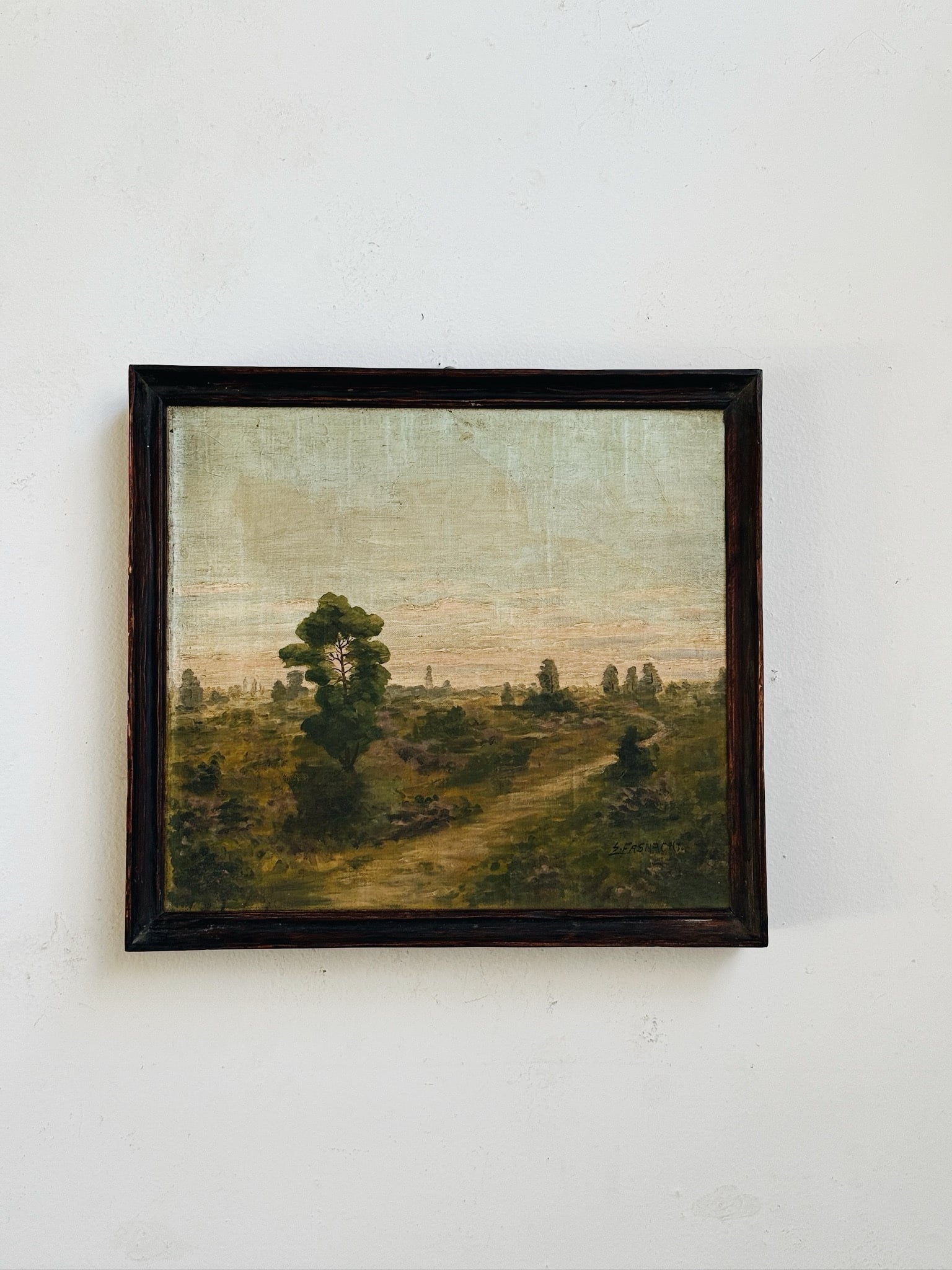 A soft landscape painting with muted tones that evoke the softness of sunrise. The canvas is uneven in parts, due to age and weathering, but paint is intact. Sourced in France.