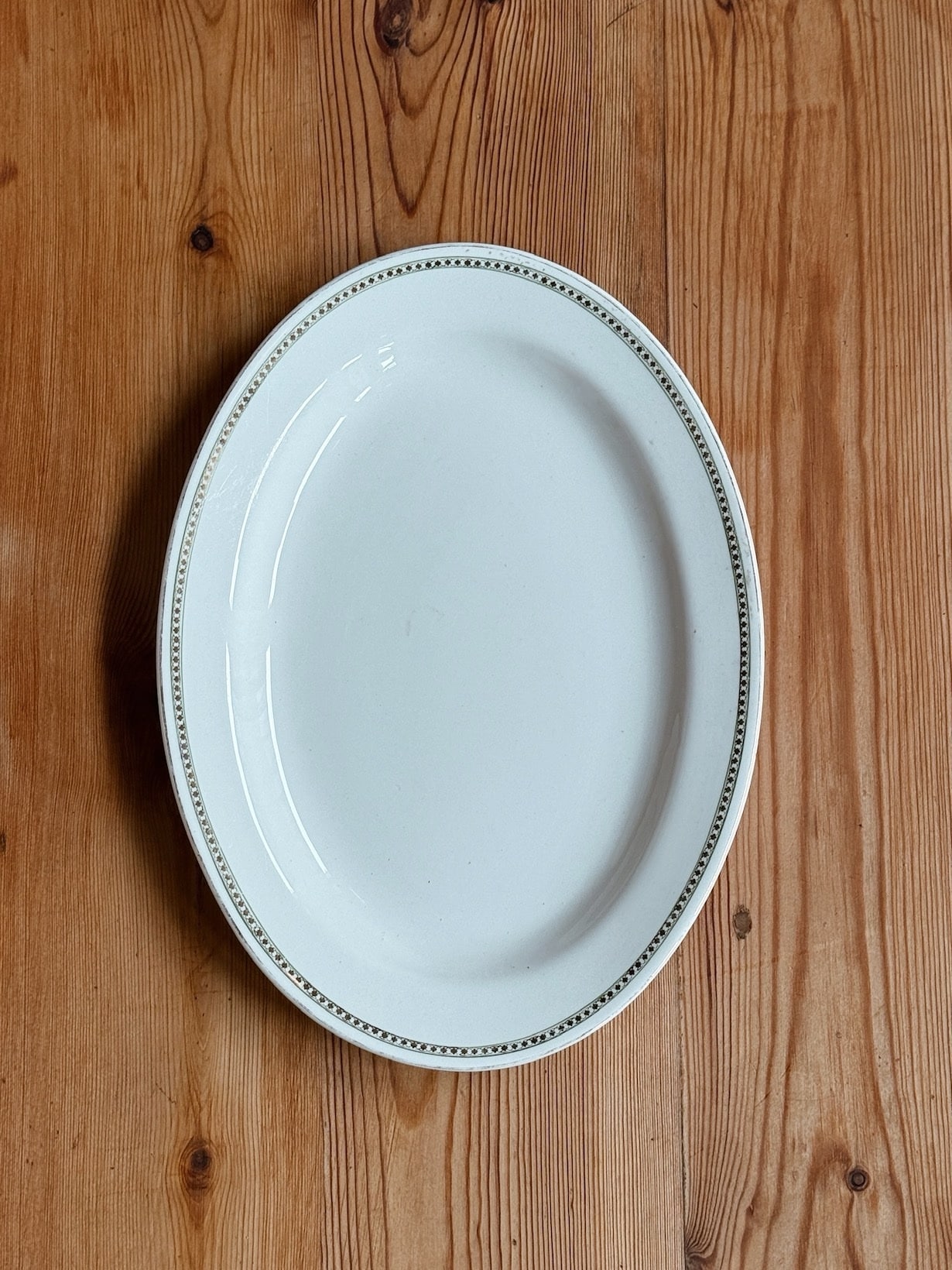 A petite green and gold rim detail adorns this antique platter, giving it just a hint of festive detail.