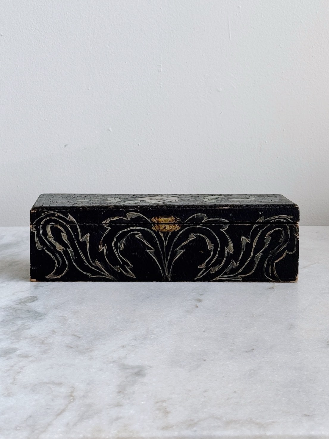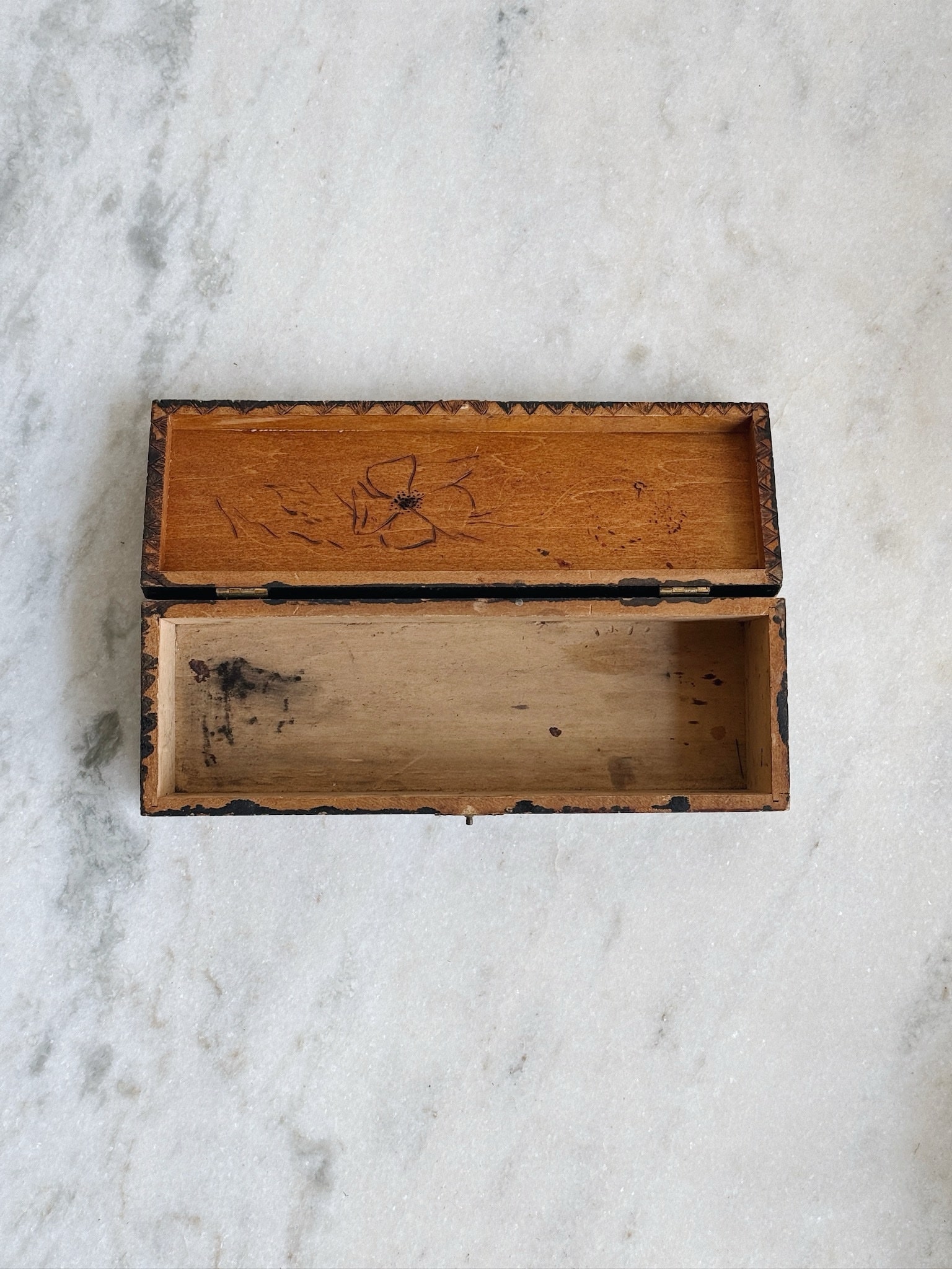 Made by hand and clearly with love, this carved wood box would have held gloves, given the shape. The coloring is in such beautiful condition, while the hinges are a tiny bit loose. Would be perfect on a vanity, or on display.