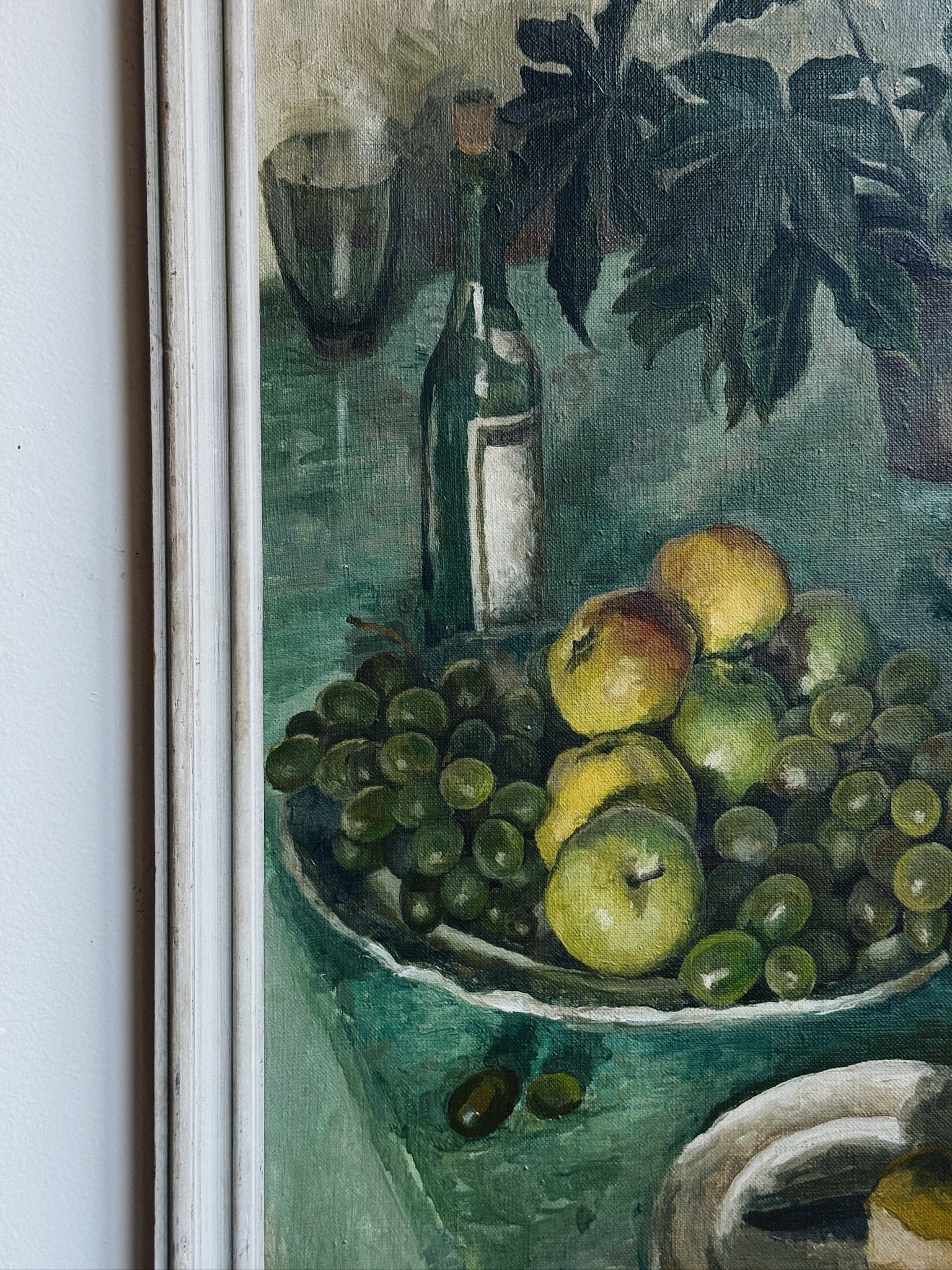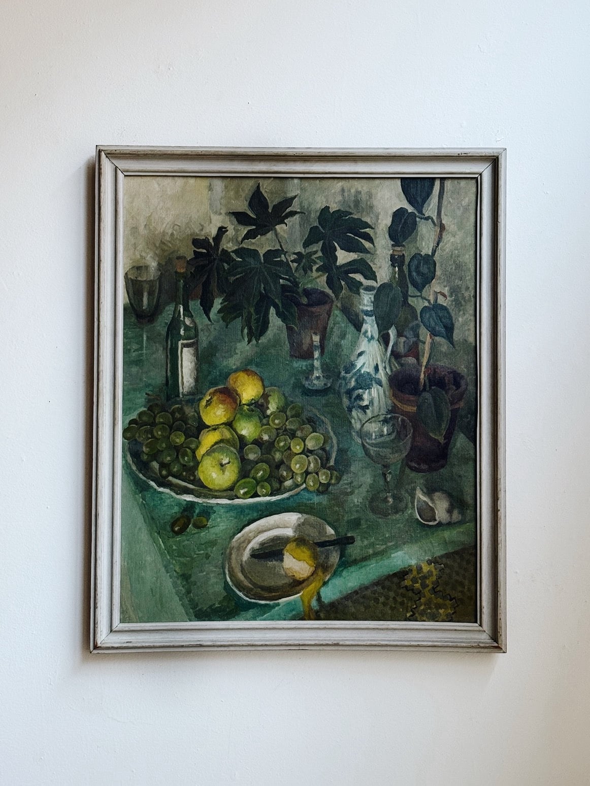 A beautiful, tonal mid-century piece! We love the layers of detail to discover in this painting, from the plant life to the items on the table itself. Unsigned, this piece was purchased from an estate of the English artist Pauline Plummer’s work, giving us reason to believe this was also painted by her.