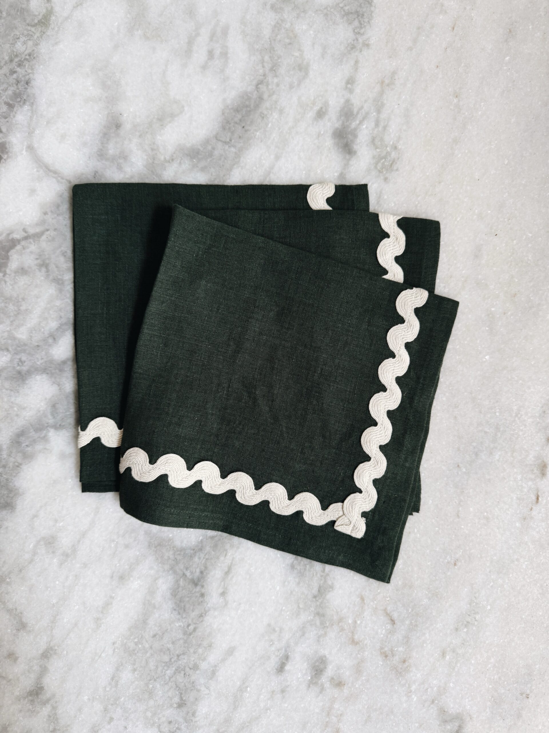 Featuring a contrasting cream ric rac trim, these 100% linen napkins will bring all the charm to your holiday table. Sold in pairs.