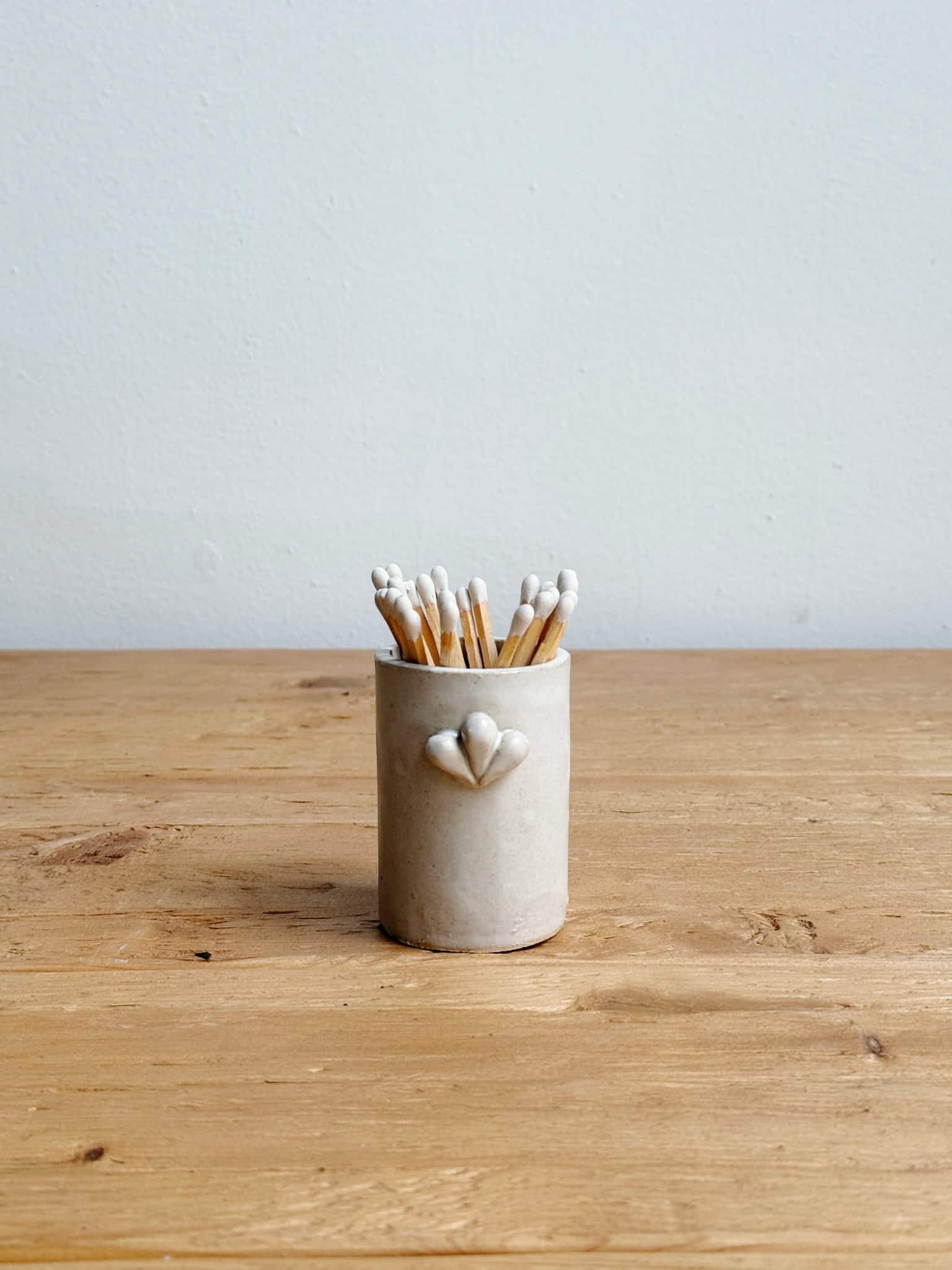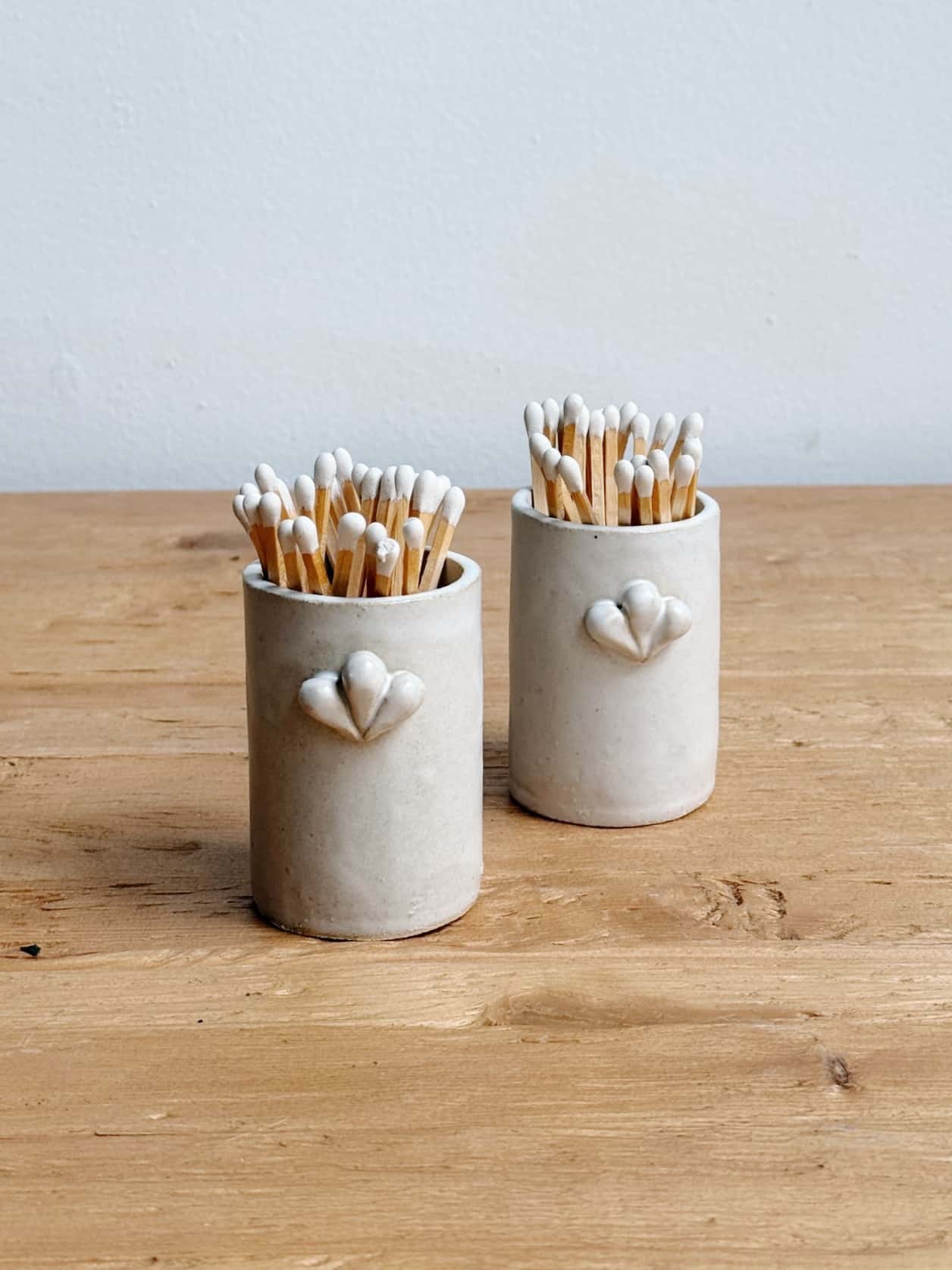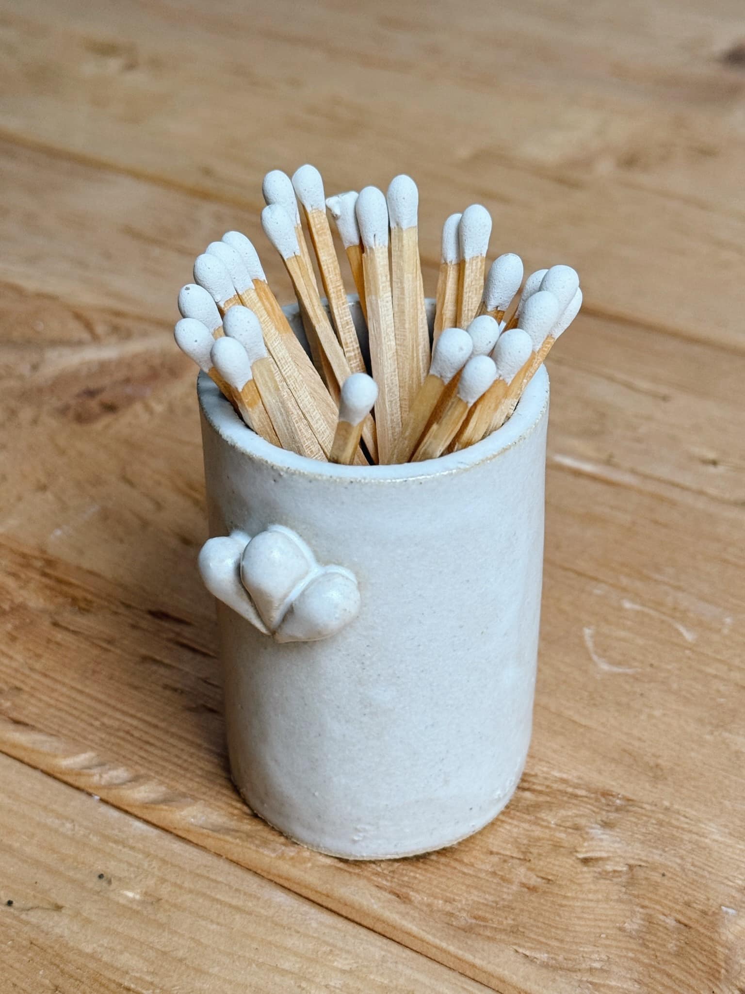 A sweet way to have matches at the ready for candles and fires. Handmade by Salto Ceramics, each holder has a striker at the bottom. Matches included.