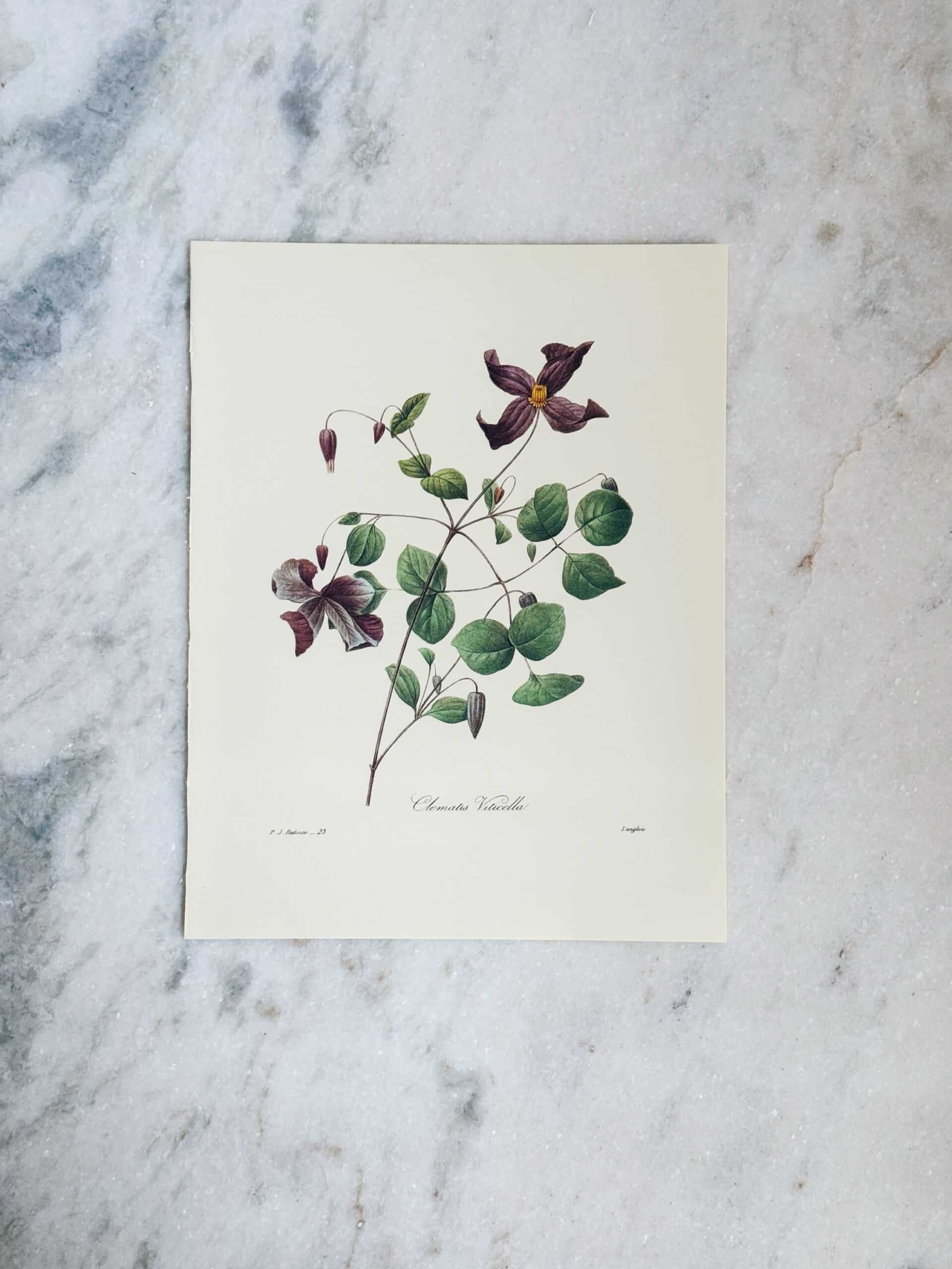 Vintage print in great condition from Beautiful Flowers and Fruit by Pierre-Joseph Redoute. This book is a reproduction of antique works from the early 1800s, emphasizing a scientifically exact depiction of these flowers. Each one is gorgeous, it’s hard to choose a favorite!