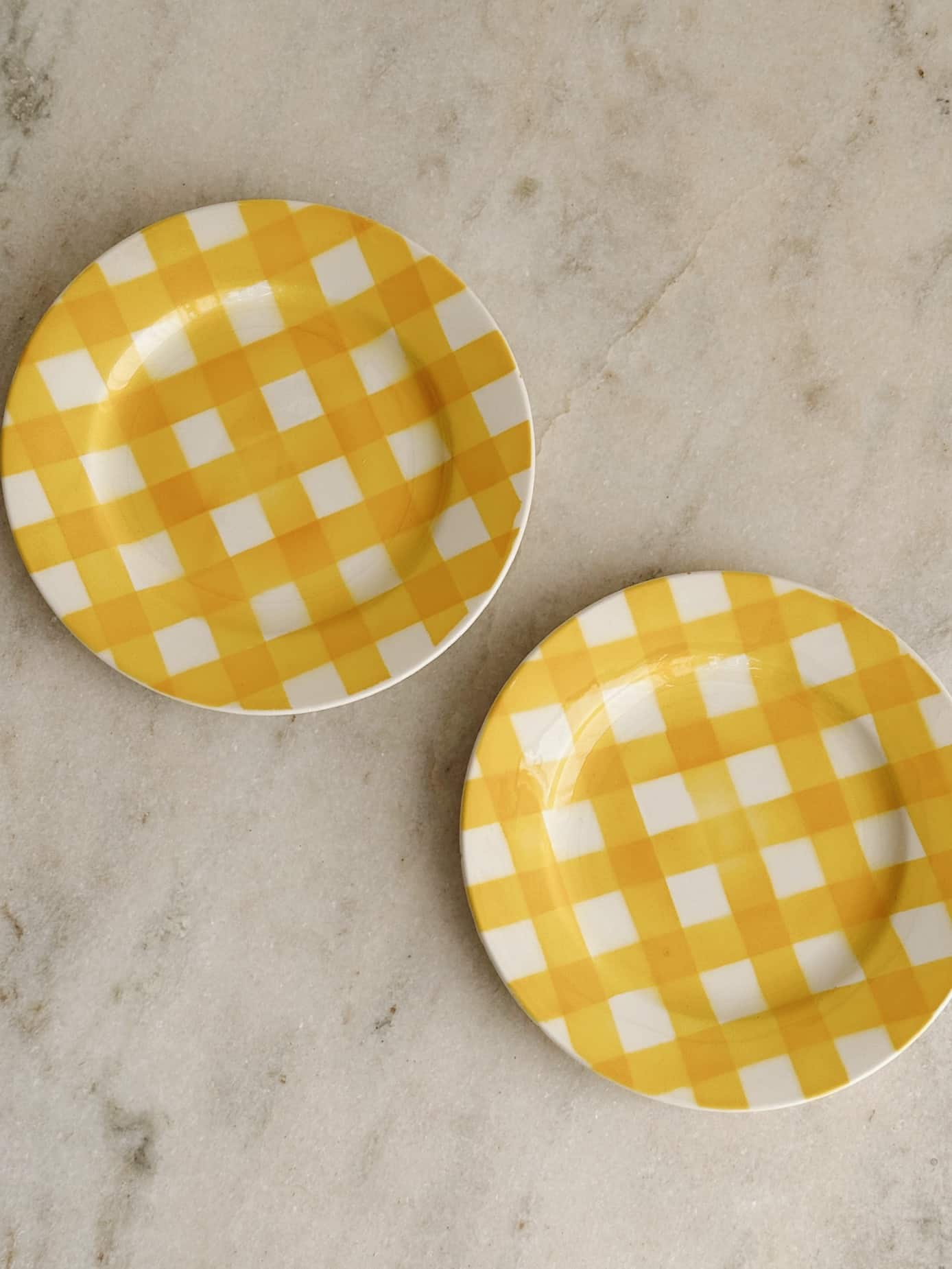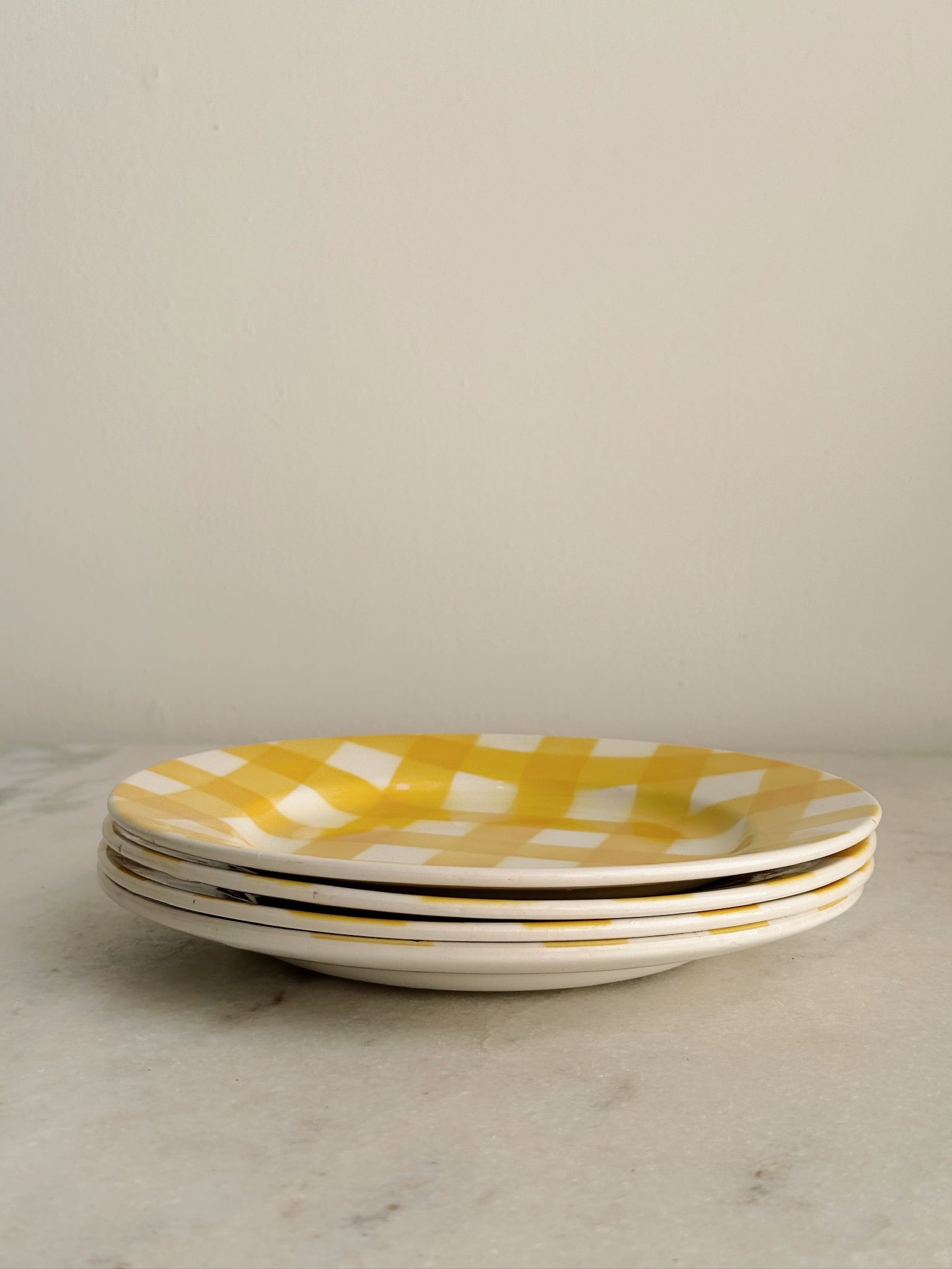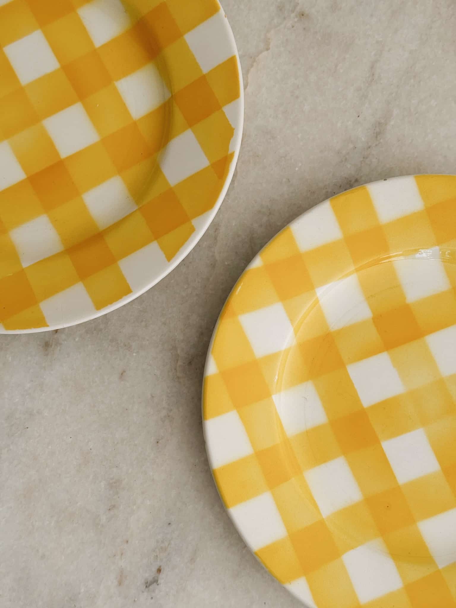 These vintage French dishes feature a printed gingham pattern in cheerful yellow to liven up your table any time of year. Sold in pairs.