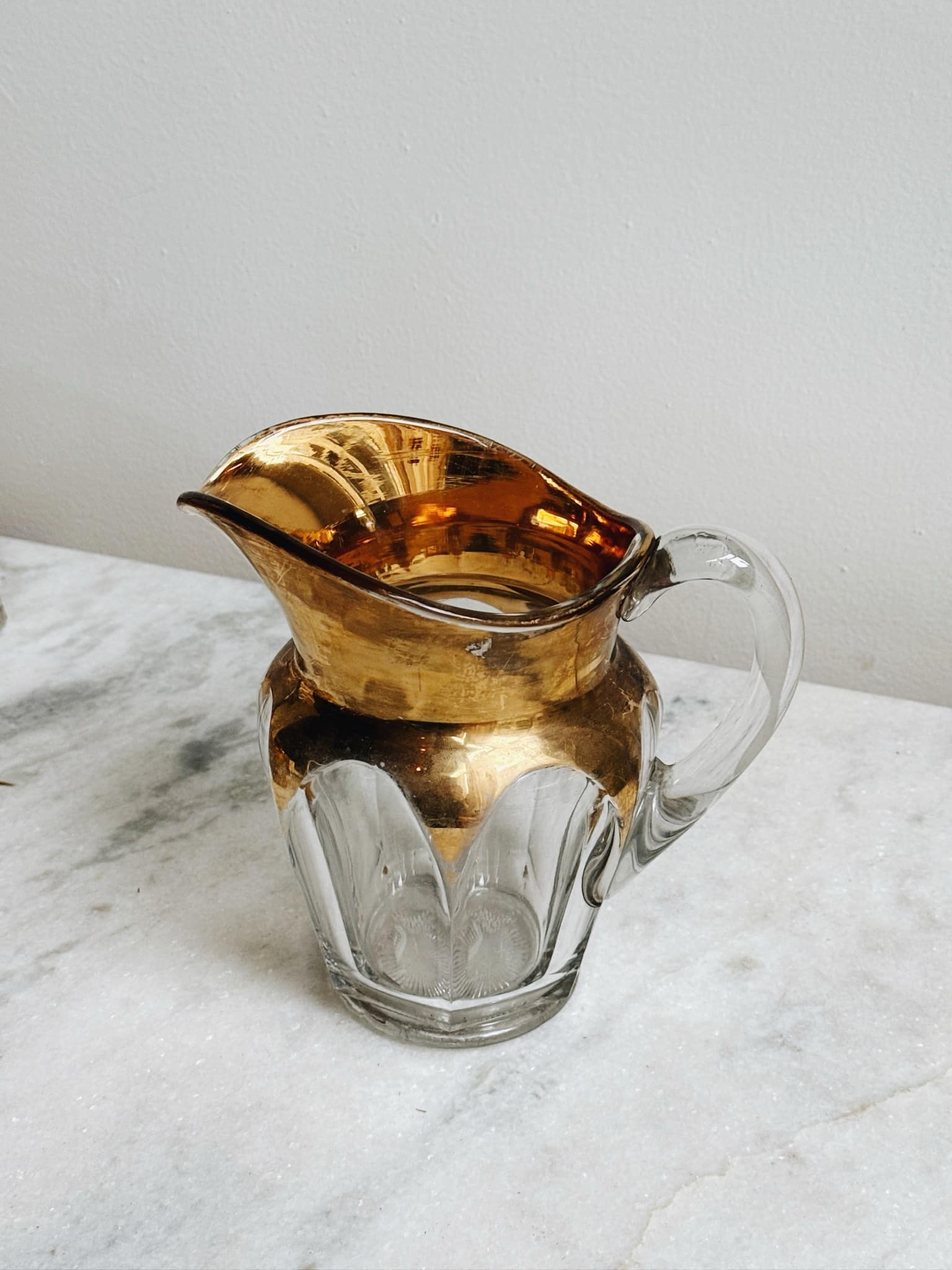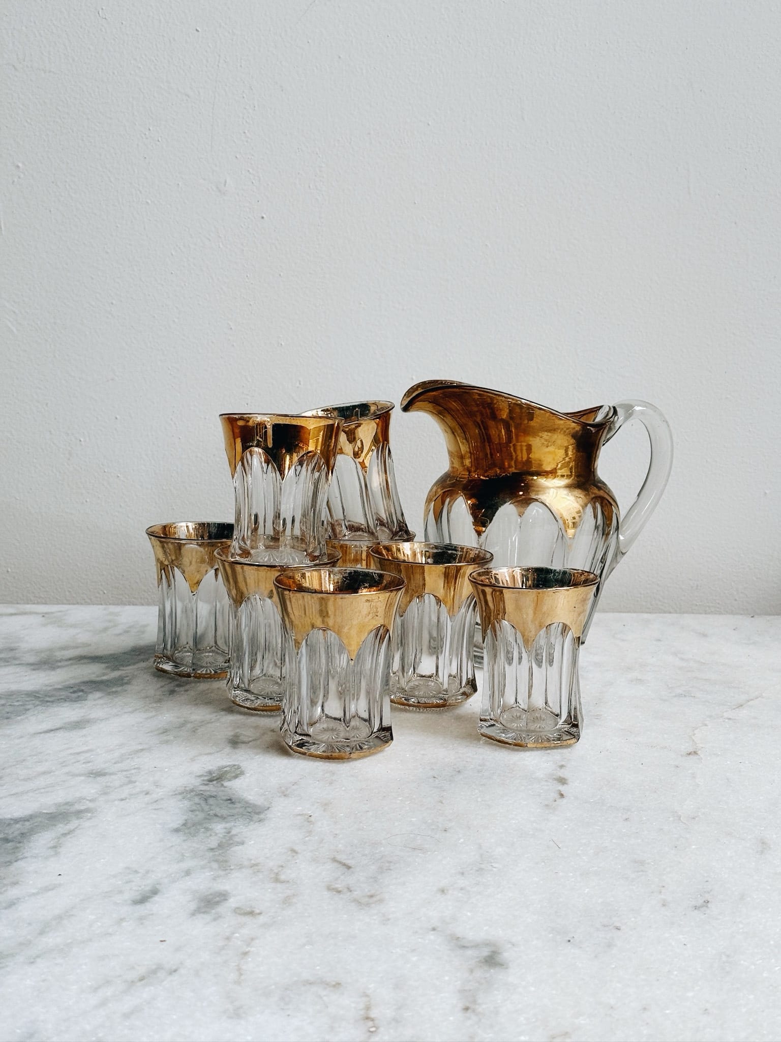 We love this festive glassware! This set has been a work in progress as we collected bits of it over time. It now includes a large pitcher and 8 glasses, all in different condition. Some glasses have more wear on them than others where the gold has rubbed off. All part of the charm!