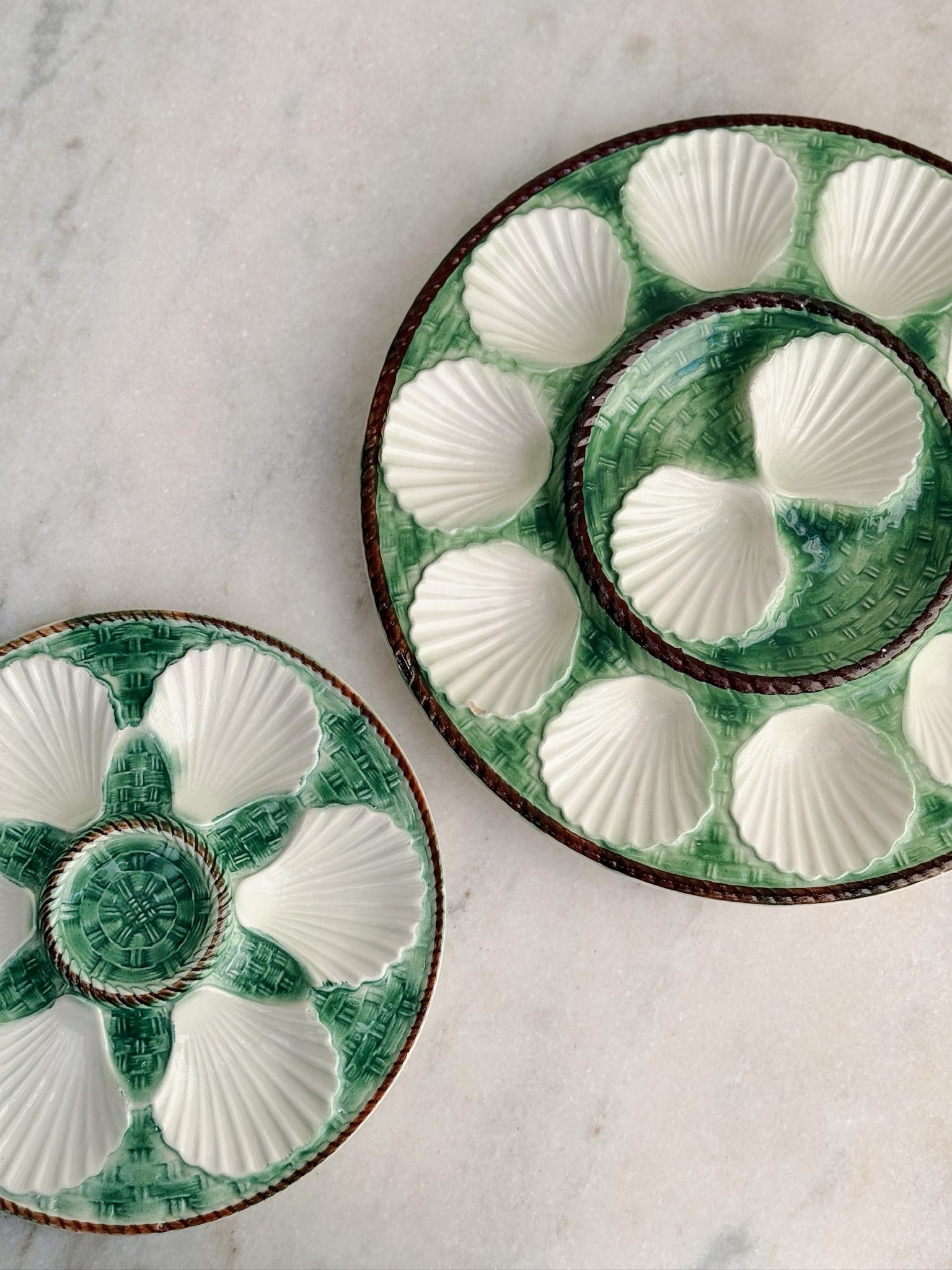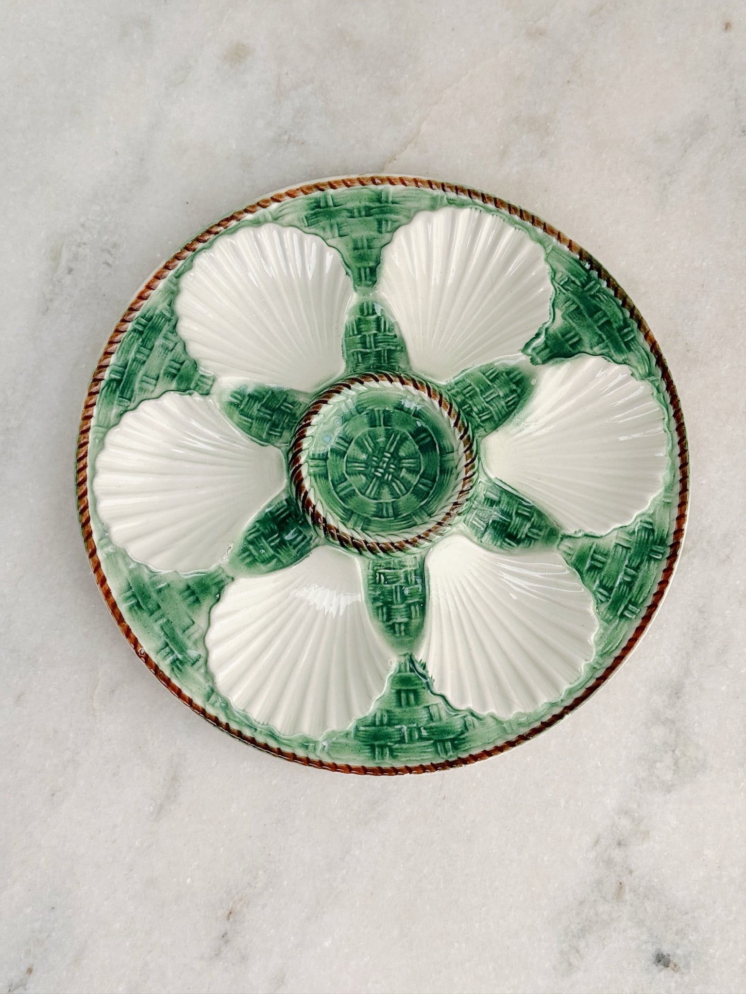 A classic majolica oyster plate from the French ceramics maker Longchamp, each one slightly unique in its glaze. Made in the 1940’s.