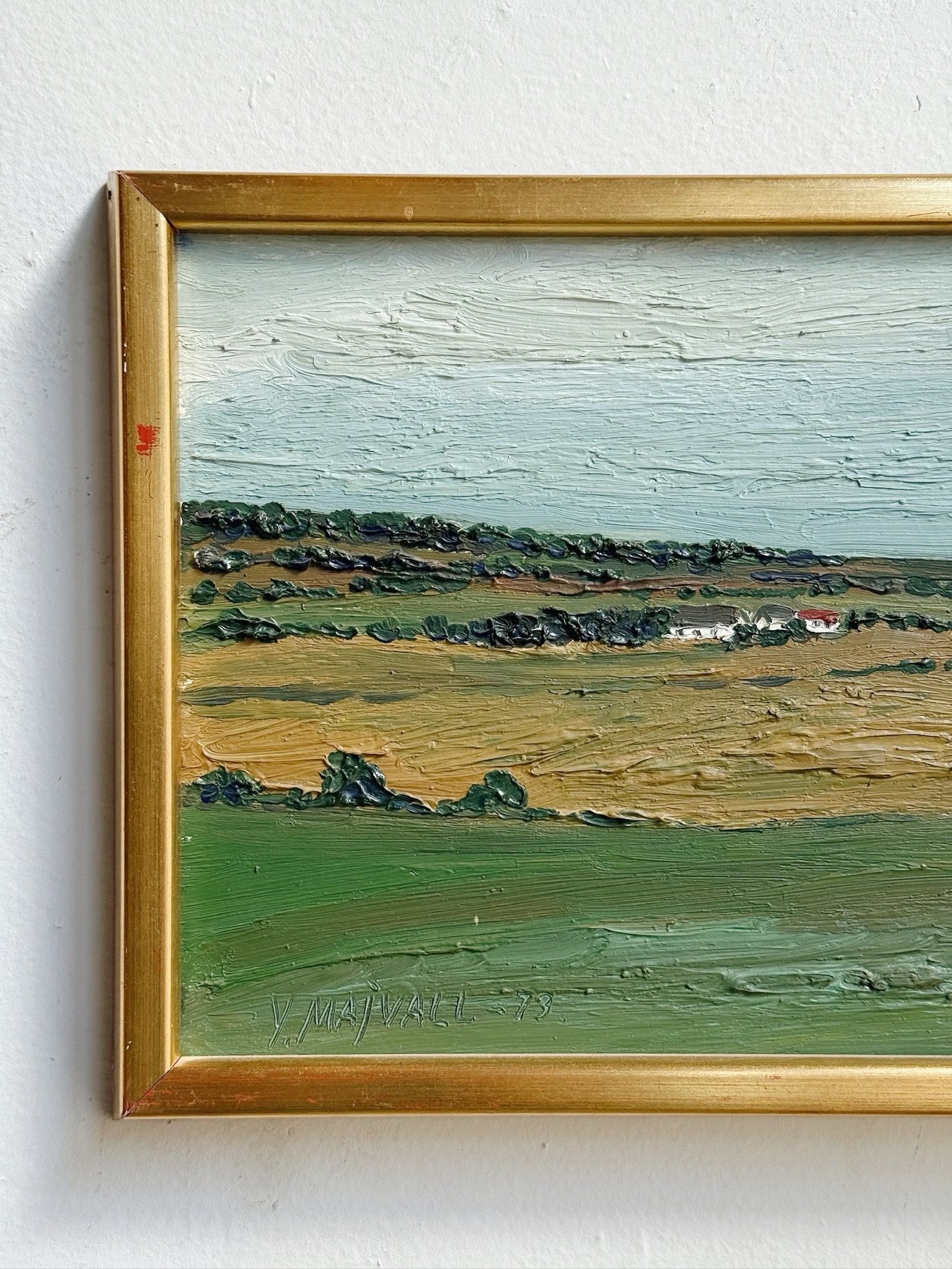 Signed and titled on the back “Från Mön” (From the Moon) Signed by the artist, Yngve Majvall and dated 1973. A detailed and textured idyllic landscape in its original gilt frame.