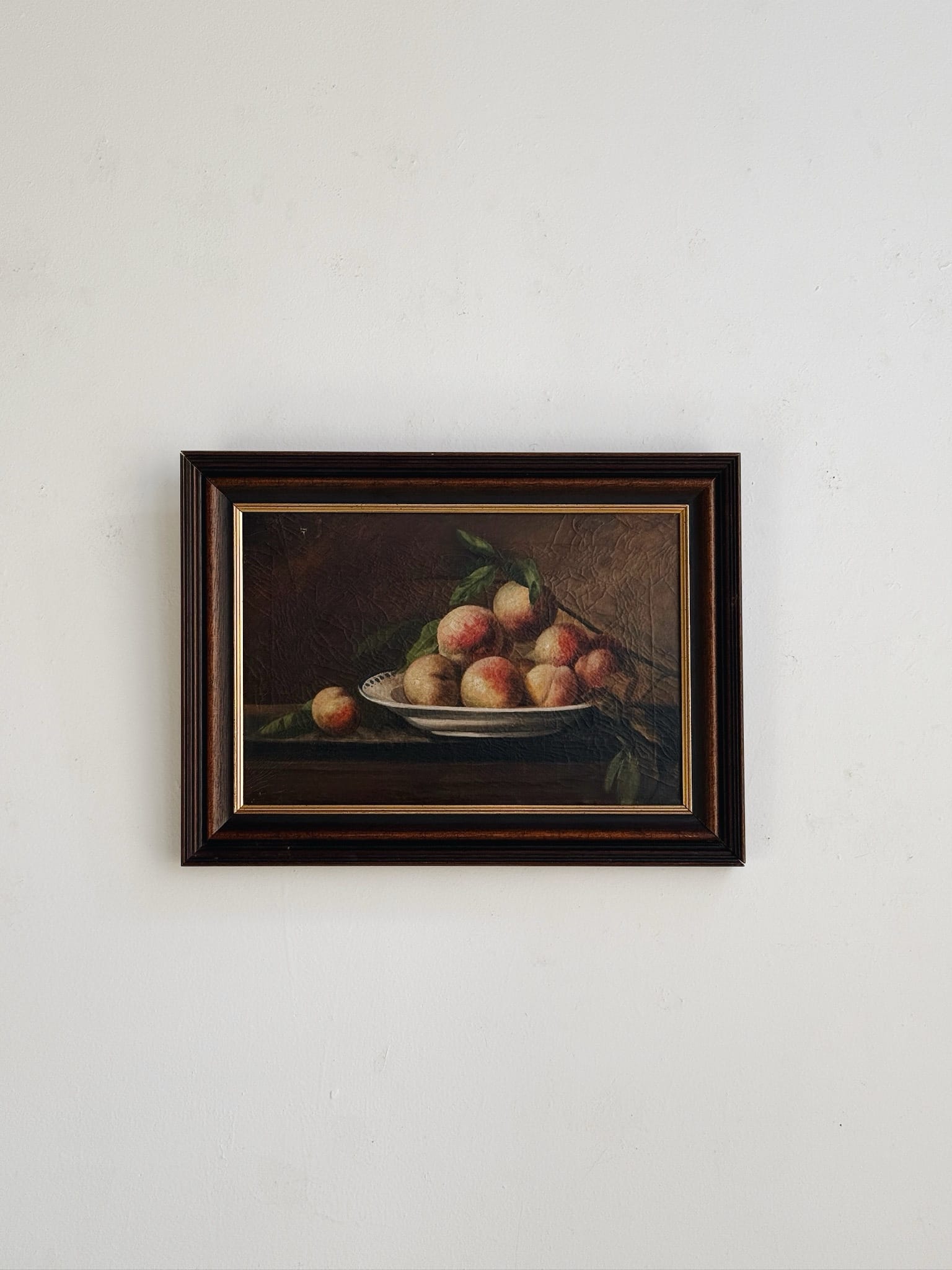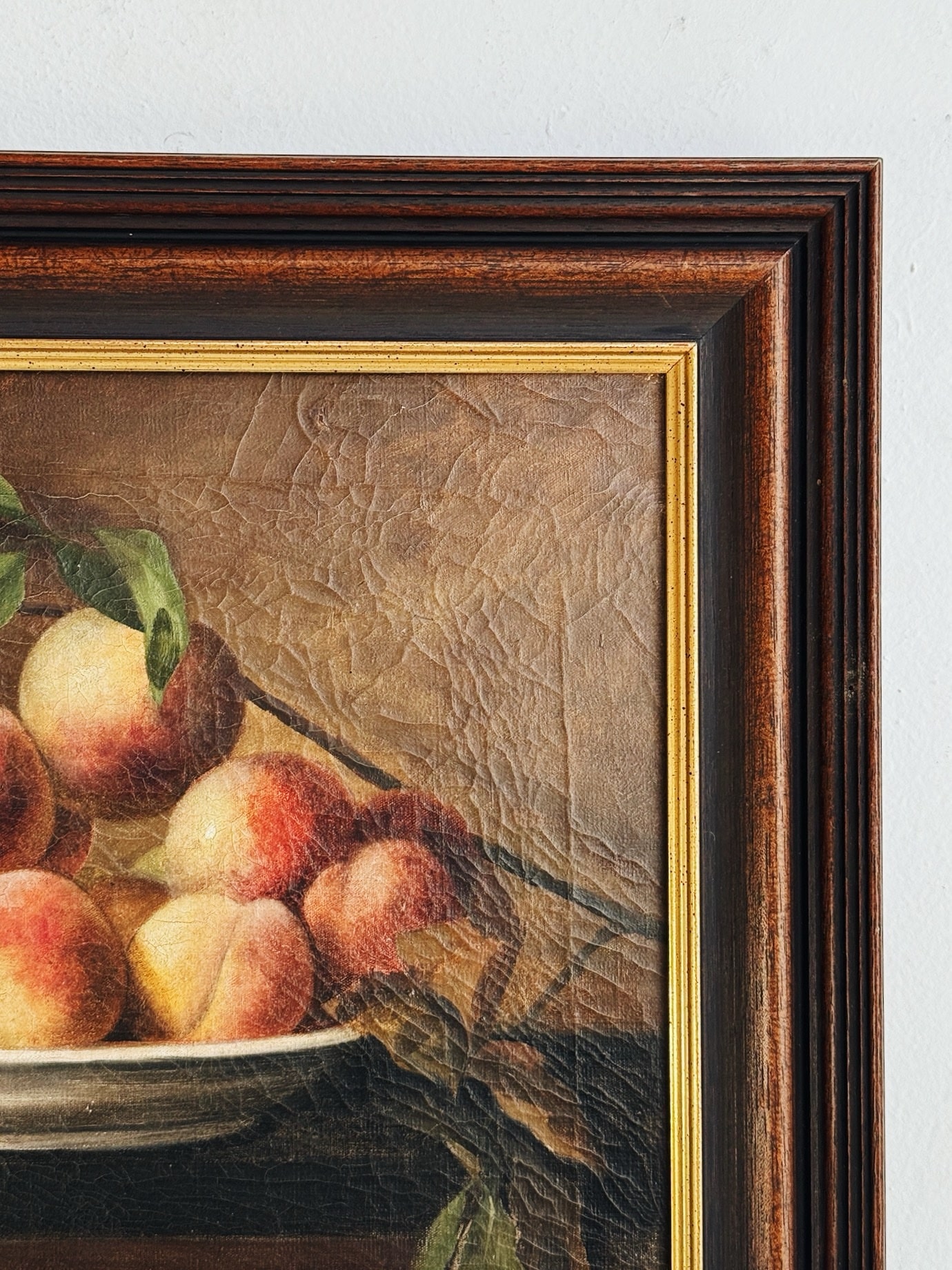 A quintessential still life featuring a moody background, piled peaches, and perfect ceramic bowl. The canvas shows some craquelure. Original frame.