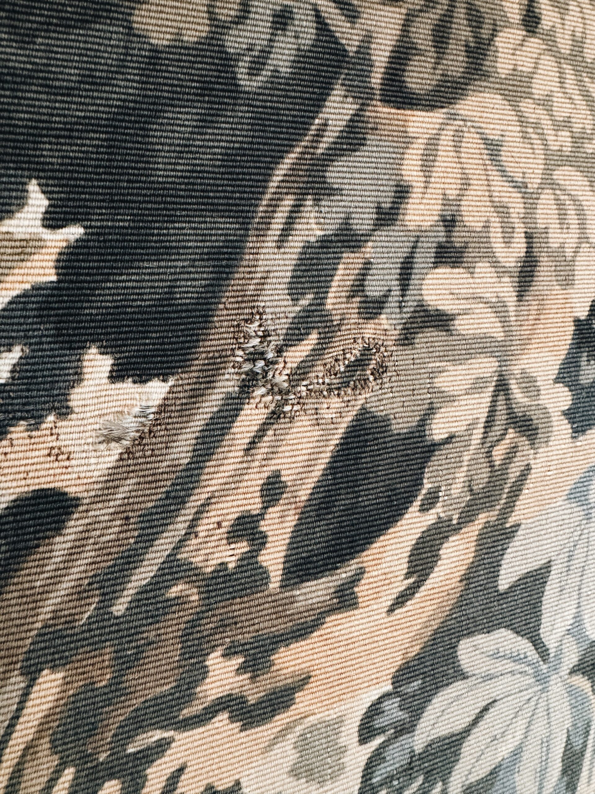 This large machine-woven tapestry from France has been stretched like a canvas to create an instant, oversized piece of art. Judging from the weave, as well as the wear, our guess is that this piece maybe be from the 1940’s-50’s. It is marked on the back as being Made in France. There are areas of wear that have been patched (see photos) and some small stains. They are very hard to see amidst the strong pattern of the piece itself.